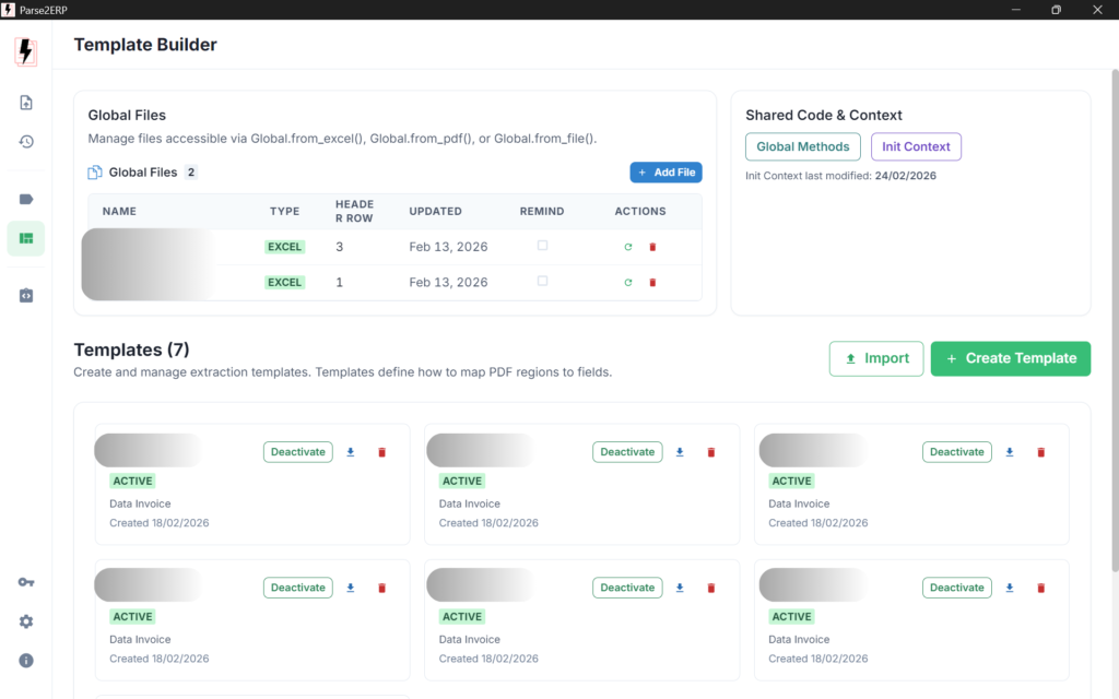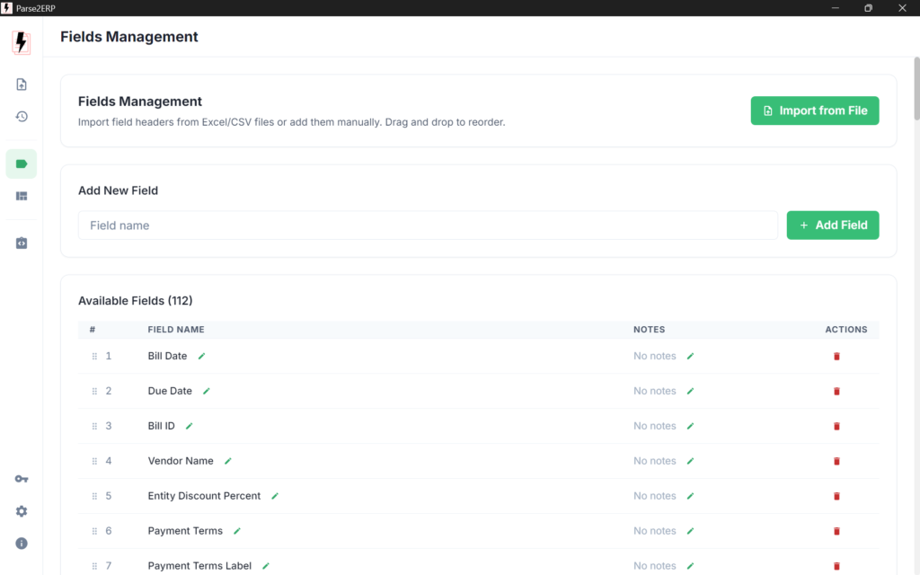 Define invoice and bill fields once per template – Parse2ERP extracts structured JSON the same way every run.